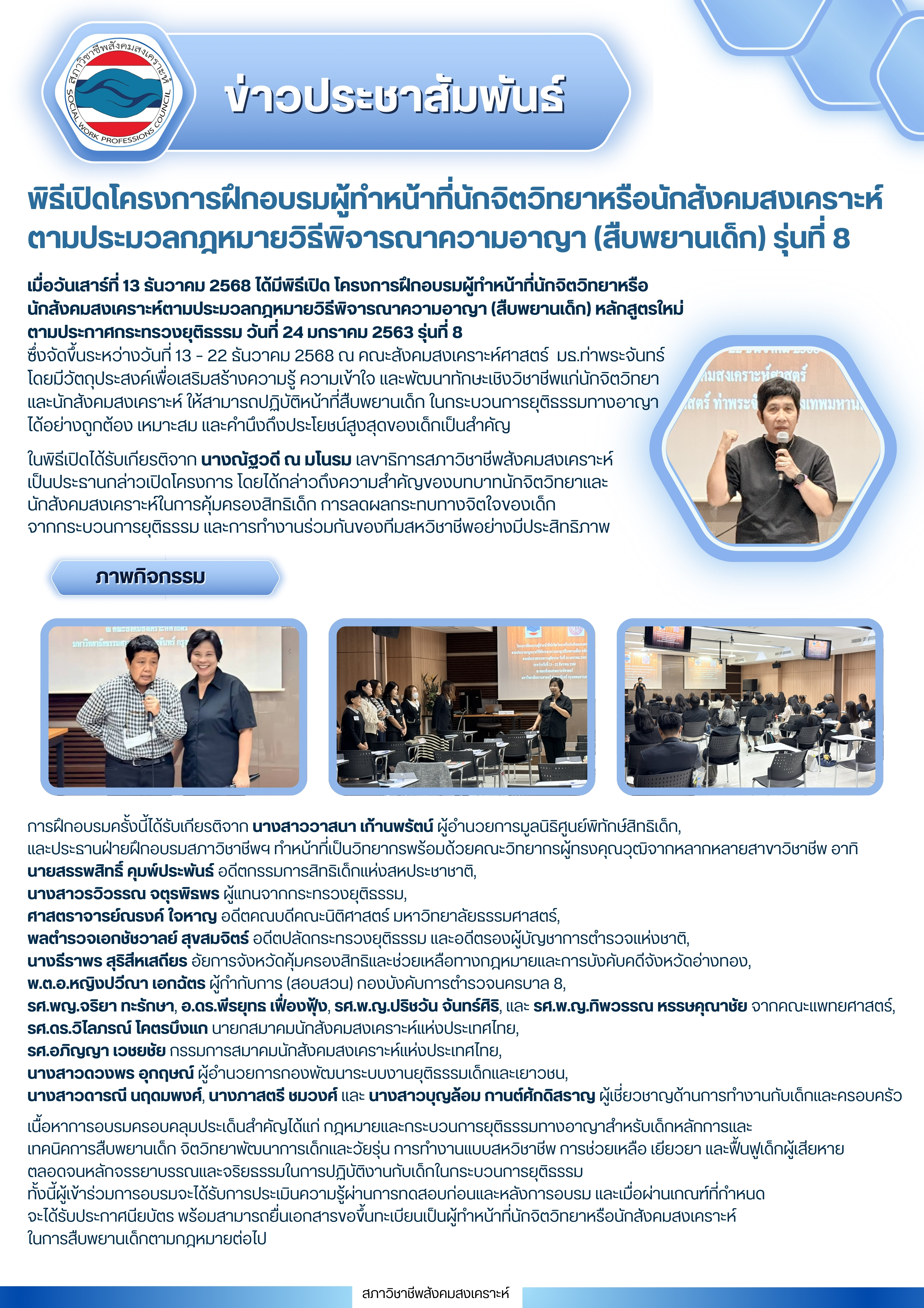 เมื่อวันเสาร์ที่ 13 ธันวาคม 2568 ได้มีพิธีเปิด โครงการฝึกอบรมผู้ทำหน้าที่นักจิตวิทยาหรือ