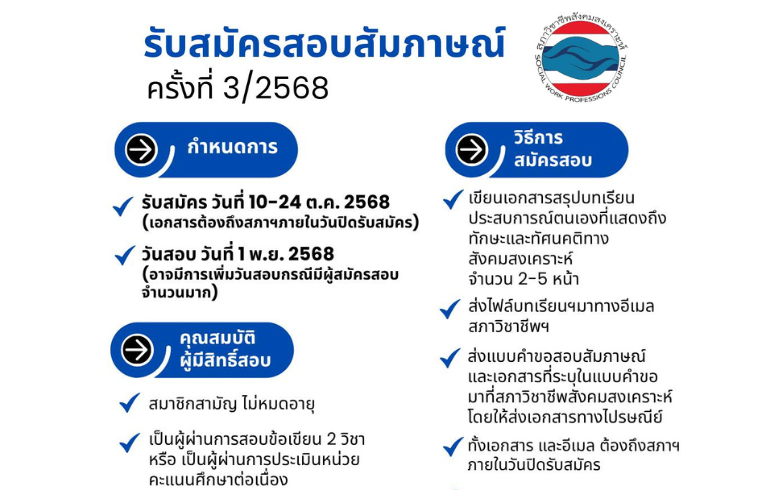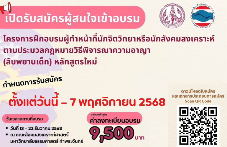 เปิดรับสมัครผู้สนใจเข้าอบรม โครงการฝึกอบรมผู้ทำหน้าที่นักจิตวิทยาหรือนักสังคมสงเคราะห์ ตามประมวลกฎหมายวิธีพิจารณาความอาญา(สืบพยานเด็ก) 2025-09-29