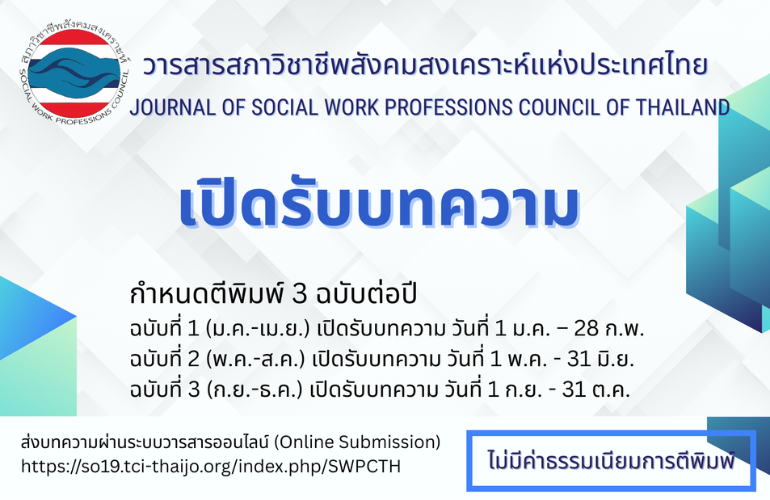 เชิญชวนส่งบทความวิจัย บทความวิชาการ เพื่อเข้ารับการพิจารณาตีพิมพ์ในวารสารสภาวิชาชีพสังคมสงเคราะห์แห่งประเทศไทย ปีที่ 1 ฉบับที่ 3 2025-10-20